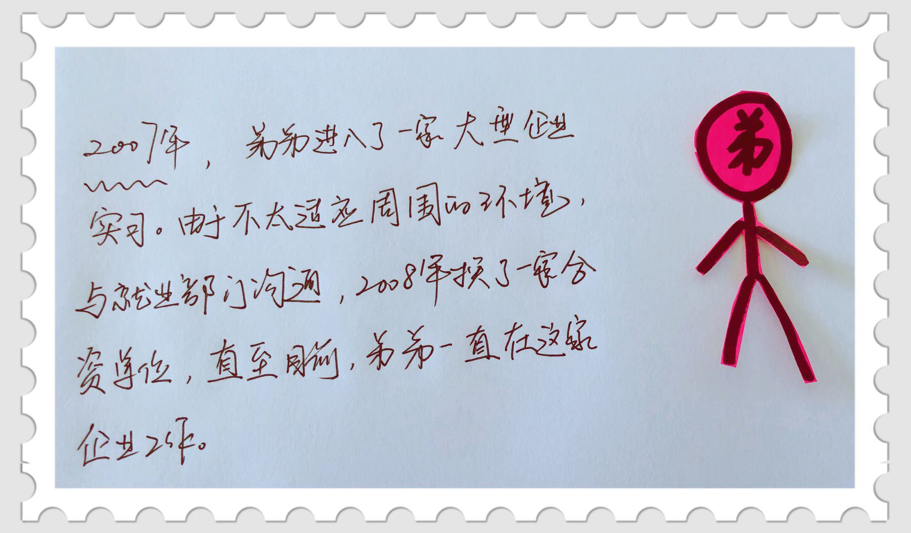2008年——弟弟不適應企業的環境,學校再次分配到一家合資單位,直到目前,弟弟一直在這家單位工作。