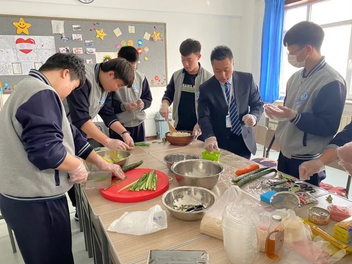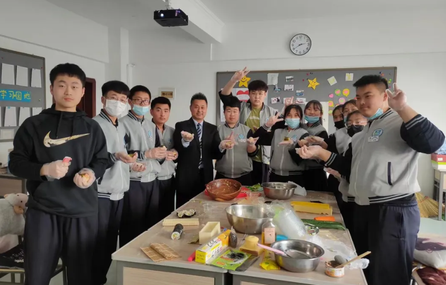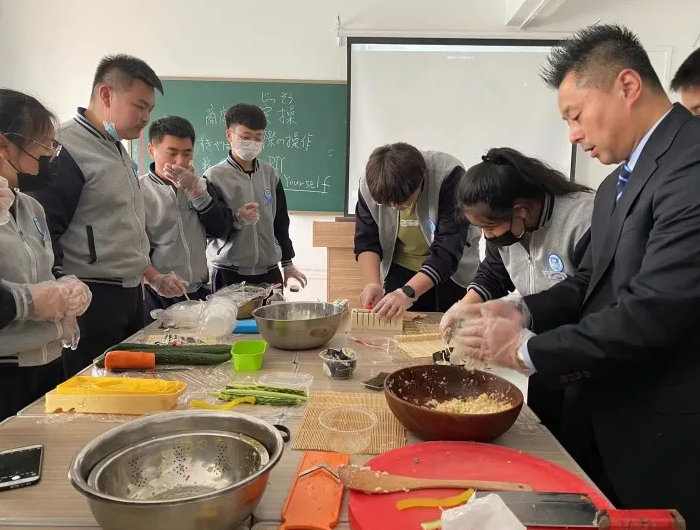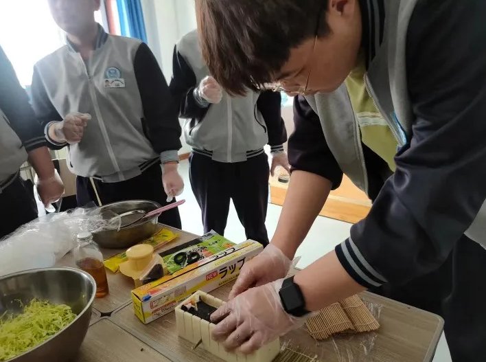 壽司是一種日本的傳統美食,日本古代時候的壽司,是用鹽和米腌制的咸魚,后經演變形成如今的壽司。通過制作壽司,同學們了解的日本的文化、飲食,也能在制作過程中進行交流、學習,鍛煉語言學習的能力和表達能力。